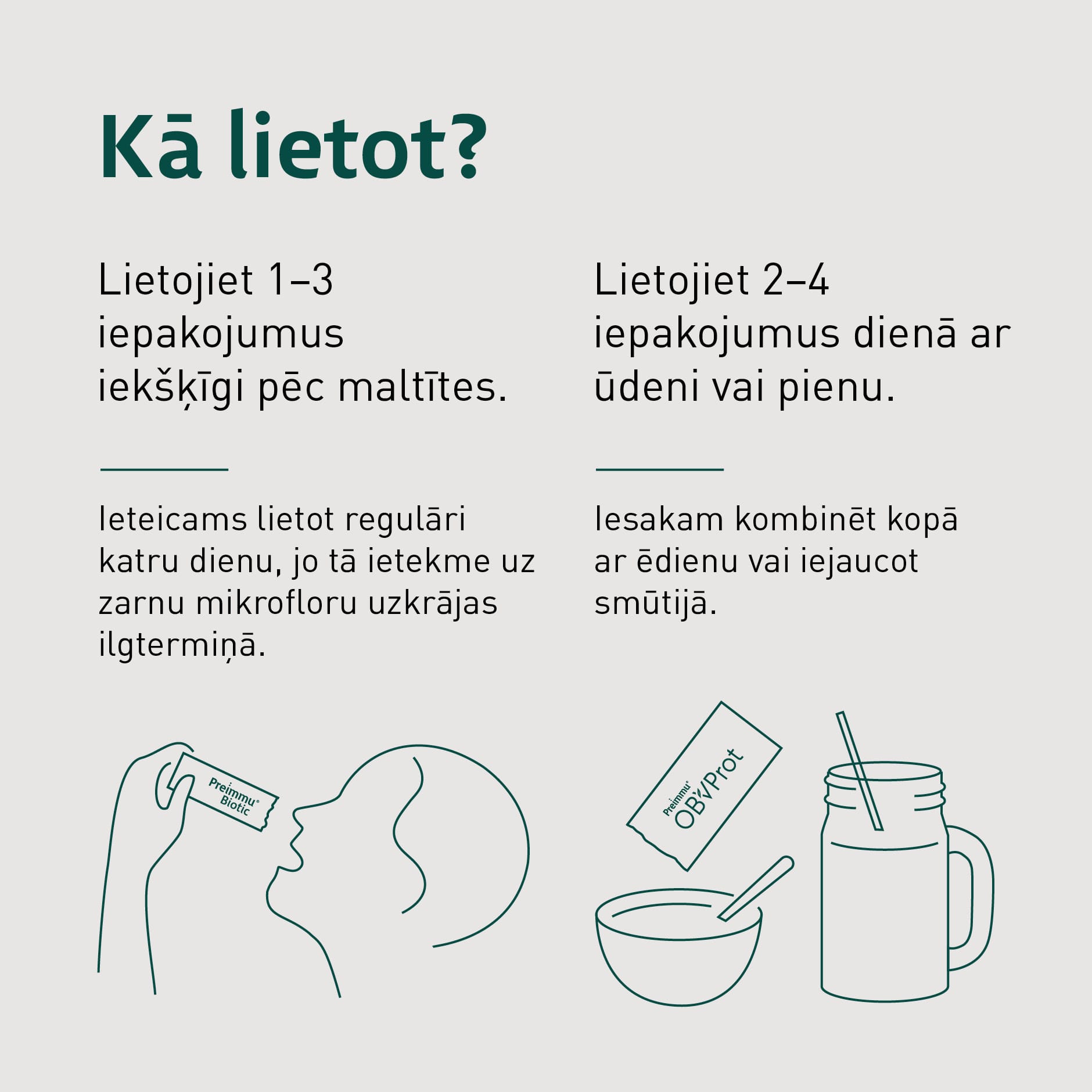 Ieteicams lietot divas reizes dienā pusdienās un vakariņās, pievienot kafijai, tējai, sulai, ūdenim vai putrai, tādejādi sniedzot mūsu labajām baktērijām arī kārtīgu maltīti, kuras tās ļoti novērtēs.